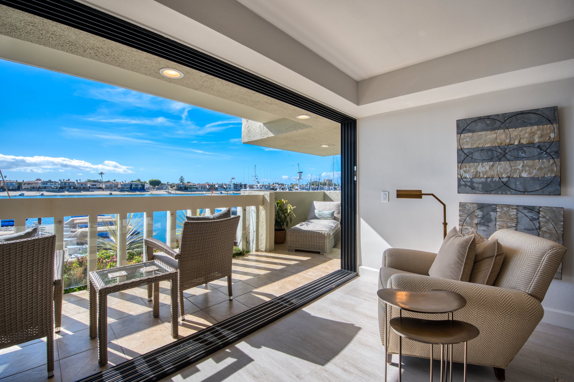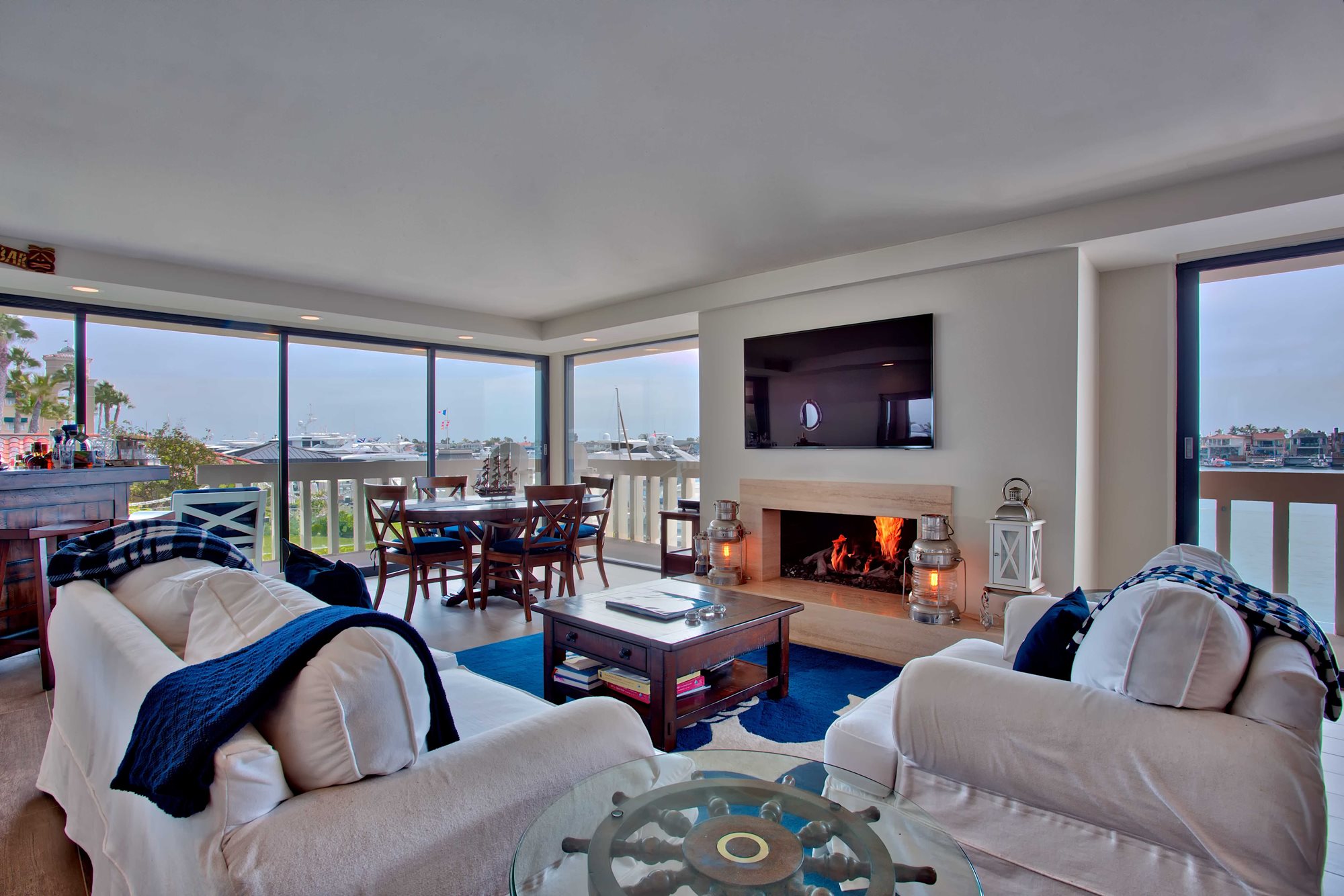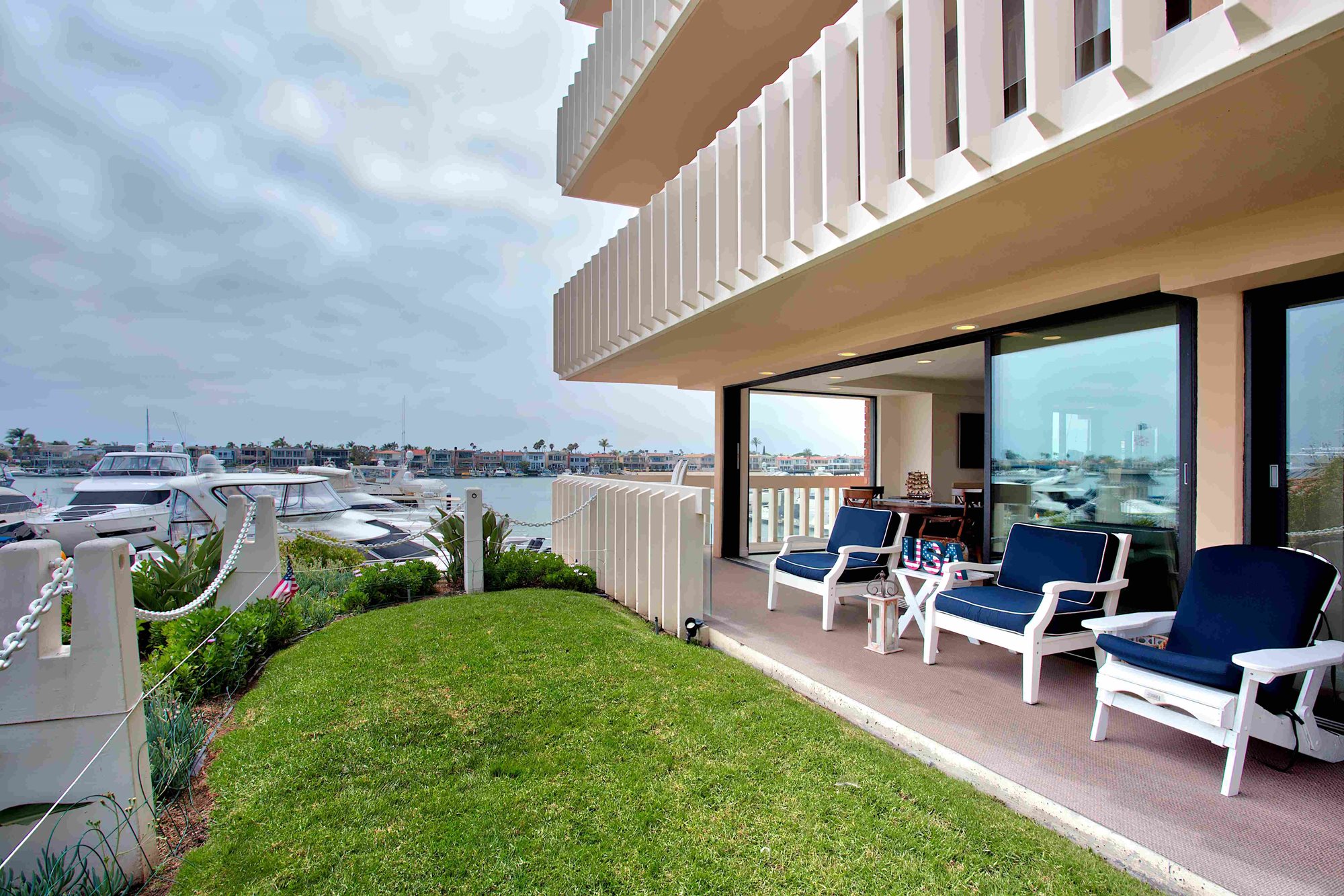 This rarely available suite is ideal for families, couples, and for hosting guests. Relax in 1,989 square feet of waterfront living space, including two bedrooms, three bathrooms and a den. You’ll enjoy a living area with extraordinary water views up and down the channel from every room, a fireplace, a washing machine and dryer, and a spacious 522-square foot wrap-around terrace which is accessible from both bedrooms and the living room.